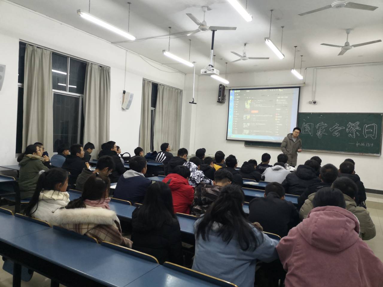 (机械学院 通讯员 赵延凯)警钟长鸣,勿忘国耻。12月16日晚6点30分,机制1914班在团支书杨志豪的组织下于北区八栋C区107教室举办了“国家公祭日”主题班会,本次班会旨在让同学们深刻了解现在和平的来之不易以及加强同学们的爱国主义教育。 会议伊始,杨志豪强调:“本次会议十分严肃,是为了纪念我们的先辈们而开展的,在会议进行中,还请各位同学不要玩手机和窃窃私语;本次会议分为两个步骤,第一项为向先辈们默哀,第二项为观看爱国主义视频,现在会议开始!”第一项步骤开始,同学们全体起立、低头向前辈们默哀;一分钟过后,班会进入第二项,大屏幕上播放了战争纪录片《南京!南京!》,随着影片结束,杨志豪向大家讲述了南京大屠杀事件中发生的事情,发生的事情比电影中所讲述的残暴得多,并希望同学们勿忘国耻,发奋图强。 本次班会中,同学们积极配合班委们的工作,班会举办成功,相信通过这次班会,同学们可以珍惜现在的和平,并争做未来国家栋梁。记住,哪有什么岁月静好,只是有人在替我们负重前行!