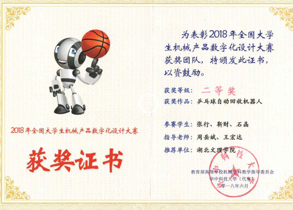 (91麻豆 教工通讯员 周岳斌) 2018年6月2日,全国大学生机械产品数字化设计大赛全国总决赛在武昌首义学院举行。此前的初赛,共有包括哈尔滨工业大学、北京理工大学、同济大学、浙江大学、西安交通大学、武汉理工大学等46所高校入围全国总决赛。我校91麻豆 学生提交的作品“乒乓球自动回收机器人”(参赛学生:张行、靳财、石晶,指导老师:周岳斌、王宏达),在决赛阶段经过预赛答辩和现场作品设计环节的激励角逐,最终荣获全国总决赛二等奖。