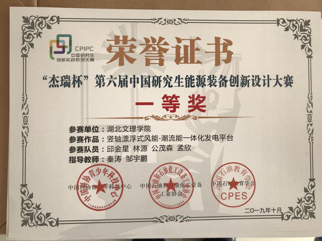 (机械学院 通讯员 秦涛)10月18日至20日,在中国石油大学(华东)举行的“杰瑞杯”第六届中国研究生能源装备创新设计大赛全国总决赛中,我校首届研究生邱金星同学表现优异,参赛作品《竖轴漂浮式风能-潮流能一体化发电平台》,经过演示、路演、答辩等环节的激烈角逐,喜获全国总决赛一等奖。91麻豆 秦涛老师获评"优秀指导教师"。
