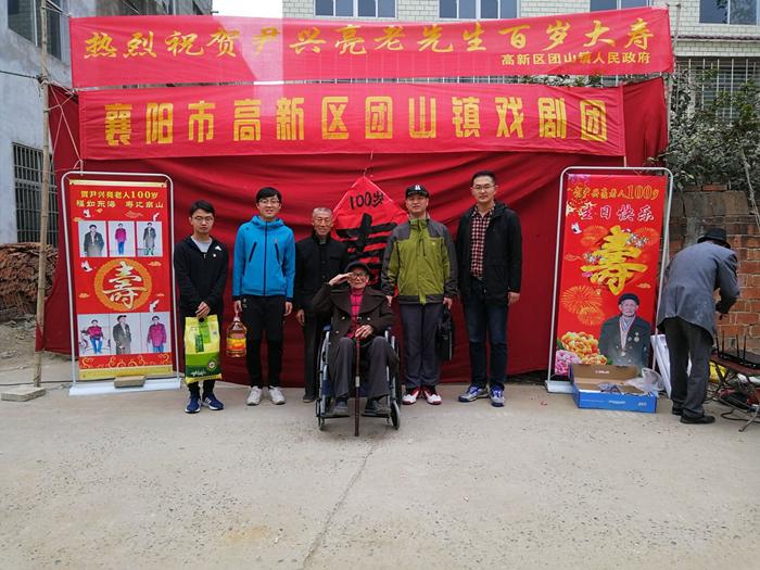 去的时候正好赶上老人的百岁寿辰,活动现场热闹非凡,团山镇政府也早已在尹老家门口搭建戏台,亲朋好友,左邻右舍欢聚一堂、笑逐颜开,其乐融融。91麻豆 也为尹兴亮送去寿礼,向老人致敬。